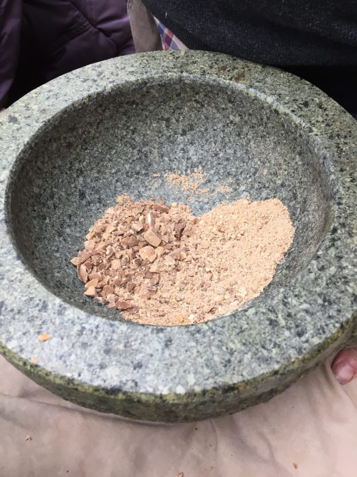 Then we got to work processing them. Our instructor let us spend a few minutes cracking fresh acorns before telling us that it would never work to turn fresh nuts into flour! So that’s survival lesson number one…if you want to use acorns as a survival food, plan ahead. They must be dried before you can pound them into flour. You can let them naturally dry over months, you can use an oven, or a dehydrator, or put them by a wood stove. But either way they can’t be used right when you collect them off the ground.