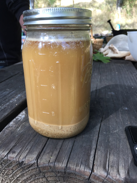 The smaller the acorn pieces, the faster they leach. We leached them in two methods…the first was to put the finely ground flour into a jar filled with hot water (photo 1 below). This could take about a week. You can taste it, and when the nut meal tastes good to you, you can use them. Replace the water when it turns brown. If you have the option, place the jar in a refrigerator because if it is hot out it can begin to ferment.