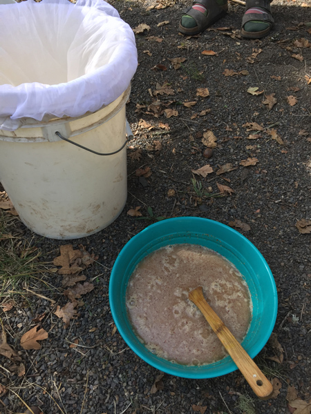 The second way was to put the flour into a bowl, pour water over it to cover and stir, then pour the whole thing through a mesh bag that you can get at a homebrew store (photo 2 below). Pour more water over the flour until it tastes good. You can “hot leach” the acorns by simmering them over a flame or on a woodstove. It can take over a day to leach whole nuts this way.