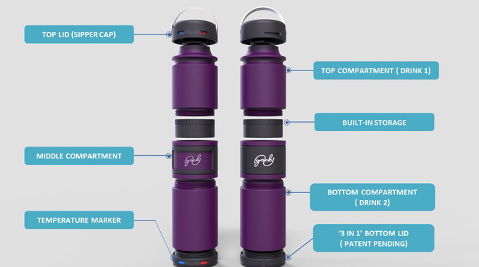 Golchi is vacuum insulated stainless steel, like all good bottles are, but has two separate compartments that allow you to store two different beverages, for those cross-country ski trips where you want both hot coffee and cold water. Or you want a smoothie and tea for your workout days. The site even suggests carrying water for mom and hot water and baby formula for the infant in one convenient item. You can switch it up to four different configurations fro, Double Decker, holding dual compartments for two different beverages, Jumbo, which turns it into a single container plus a dry storage, Traditional, which is just your everyday bottle, or Golchi Mini, which splits your Golchi into two standalone bottles.